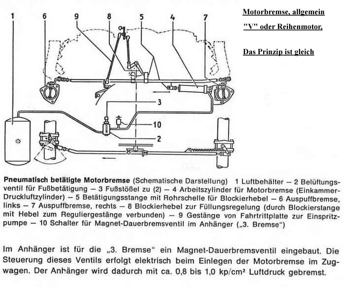 Das Prinzip der Motorbremse beim Diesel, „V“ oder Reihenmotor.