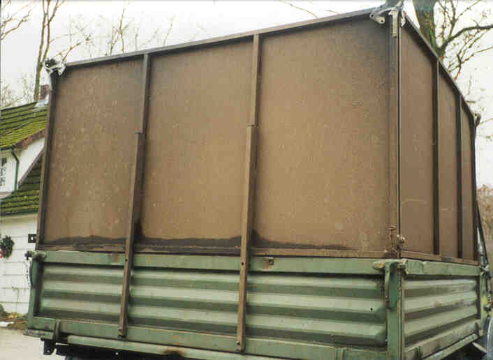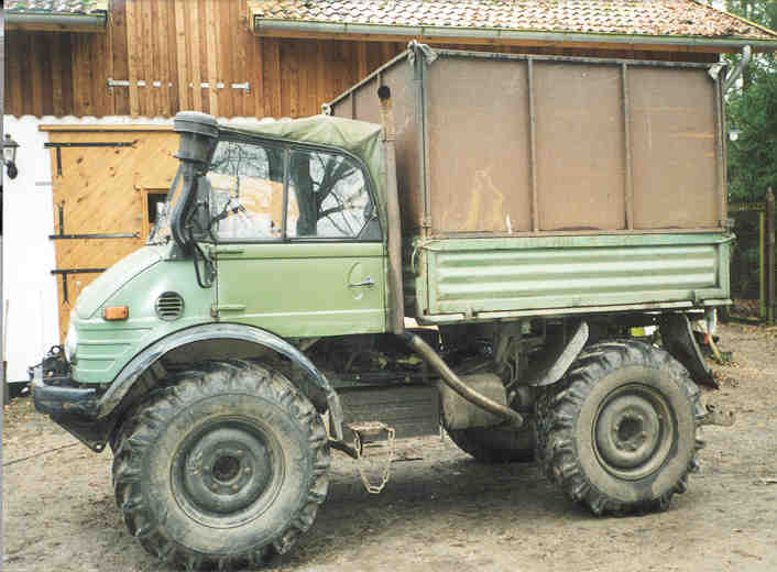 Der Unimog wurde vom Vorbesitzer zum Antrieb eines Buschhackers eingesetzt. Die Hackschnitzel wurden direkt auf die Ladefläche geblasen.